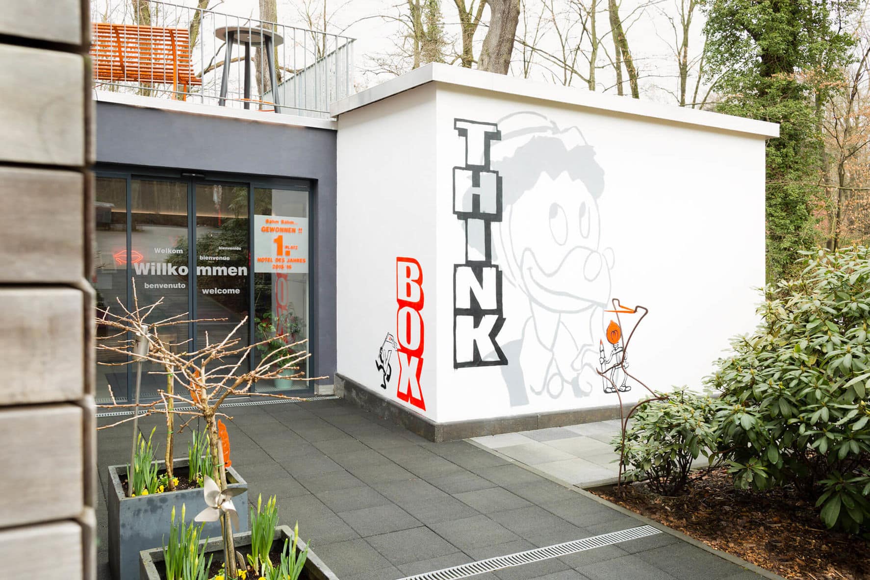 Die Helden der Jugend – frisch gemacht im V-Hotel. DROPIX ist ein Street Art Künstler aus Bonn, der sich auf ironische und liebevolle Art und Weise der Helden unser Jugend annimmt. So entdecken wir neue Seiten von Micky Maus, den Schlümpfen und Schneewittchen. Daniel Düsentrieb und sein Helferlein zieren sogar übergroß einen unserer Lieblingsräume, die ThinkBox, wie passend. Ein wundervoller Tagungsraum, ausgestattet mit Zirbenholz, Blick ins Grüne und allem, was Tagungsgäste an Technik wünschen. Der perfekte Platz für kreative Ideen und konstruktives Planen.
